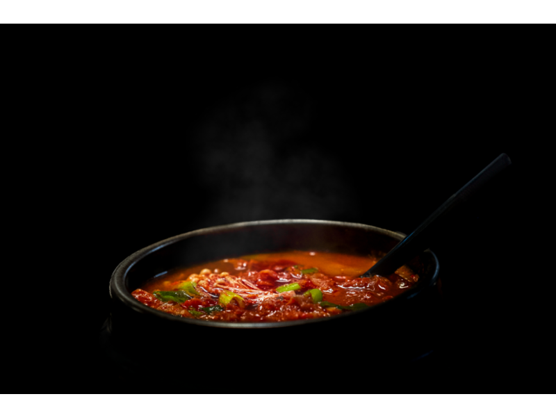 Kimchisuppe med svinekjøtt sopp, vårløk, chili, og tofu med ris. Innholder Fiskesaus, hviløk og løk