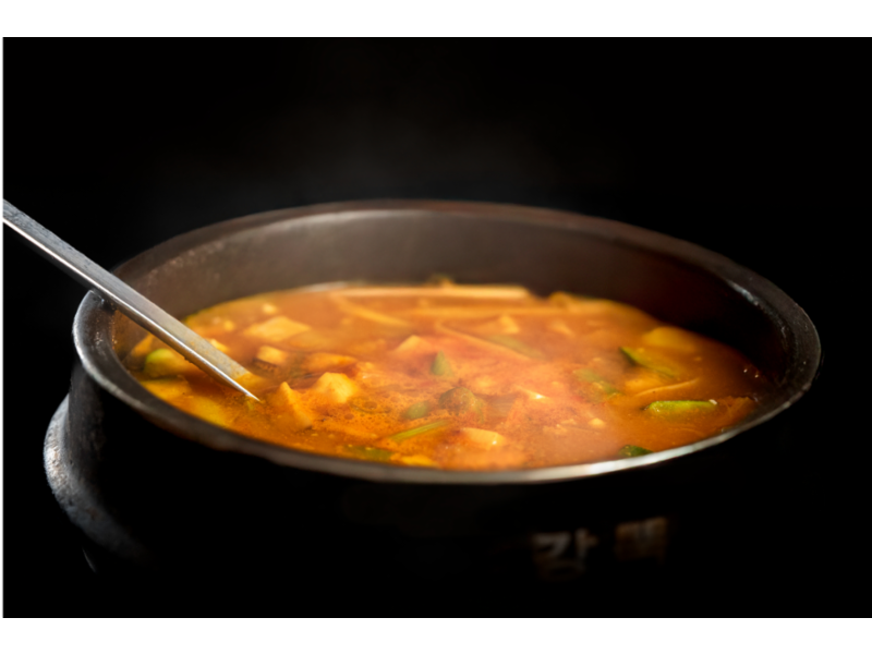 Koreansk soyabønnepasta suppe med sopp, løk, vårløk, zucchini, chili og tofu serveres med ris. Inneholder Gluten, Soya, Hvitløk og Løk
